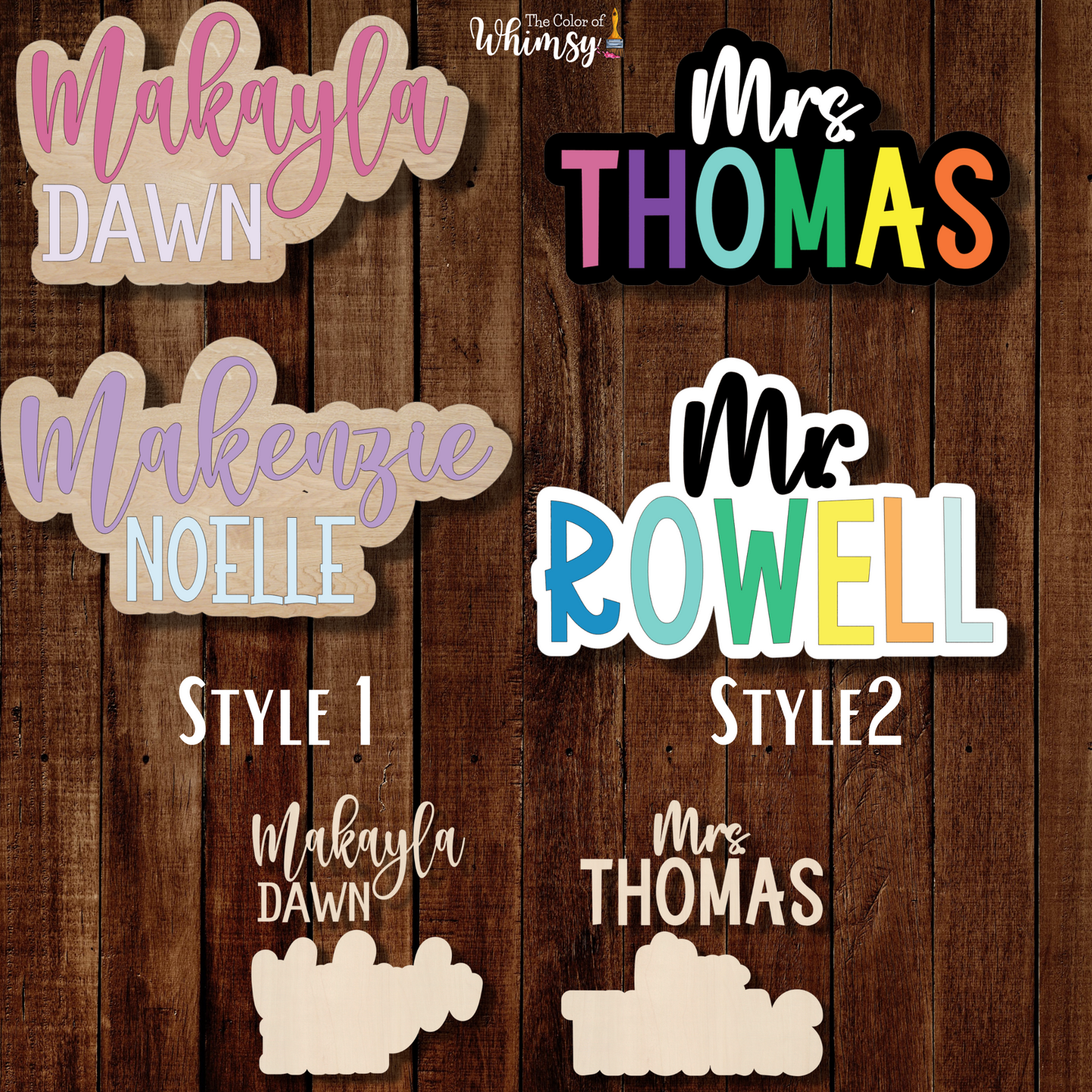 Style 2 is best for classroom/office doors. Title/first listed name will be in cursive and centered over the second listed name.