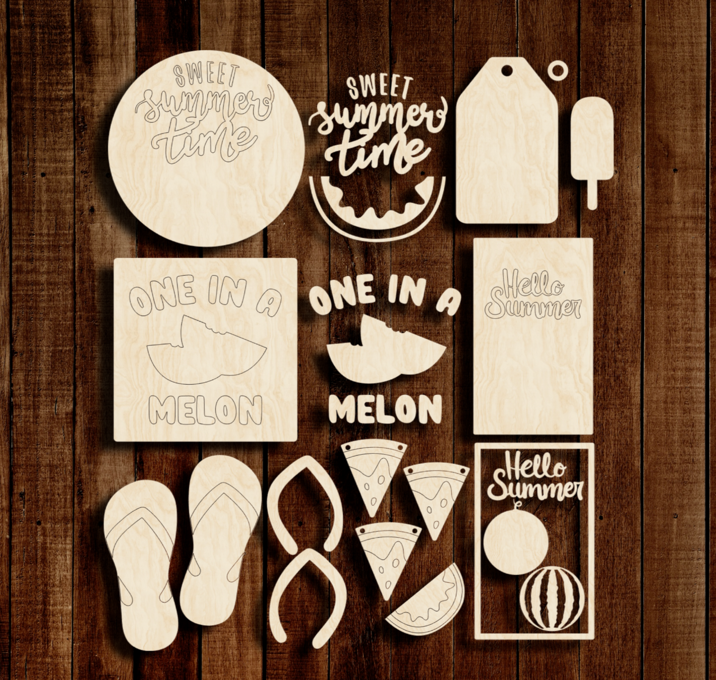 Order either the Watermelon themed tiered tray as a set or order individual pieces. Add an easel for an adorable way to display your shapes. Letters and layered items will need to be glued together. (Glue not included) All laser cut from 1/4" Birch Plywood.